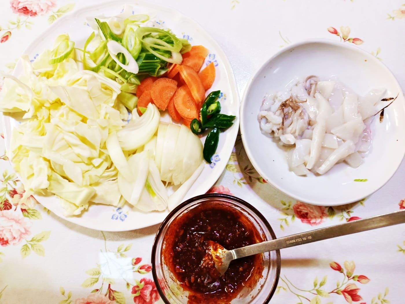 갑오징어는 적당한 크기로 잘라두고 야채는 씻어서 준비해 둡니다.