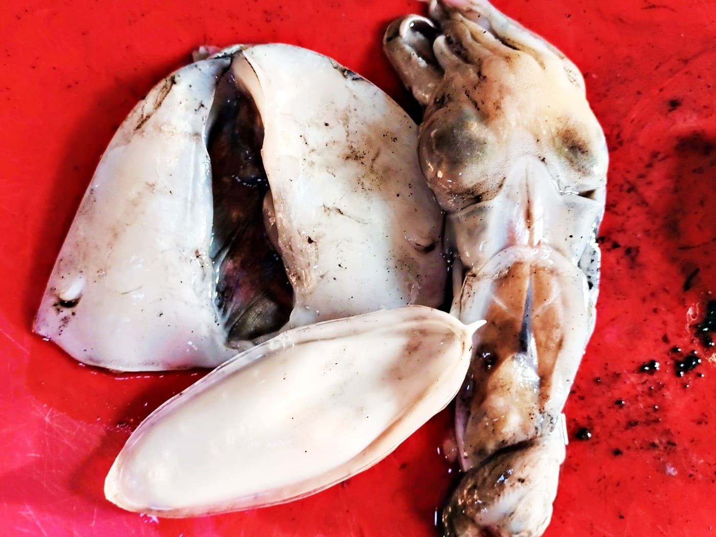 갑 오징어를 배를 갈라 서 딱딱한 뼈를 빼주고 껍질을 벗겨준다.