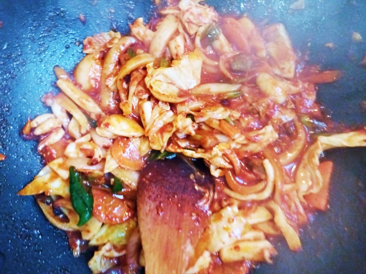 이때 양배추를 숨만 죽을 정도로 볶아줍니다.
