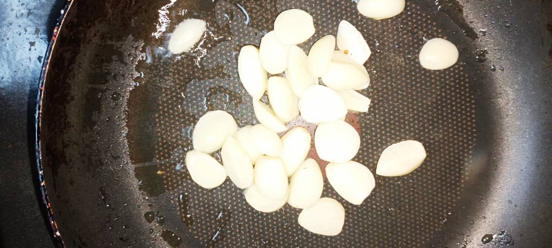 팬을 달구어 올리브유를 2 숟가락을 넣고 마늘을 편으로 썰어 볶아 줍니다.