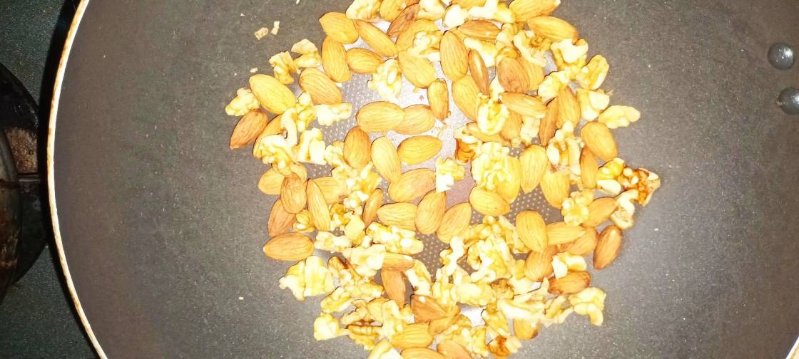 호두는 크기가 크면 먹기 좋게 잘라 줍니다. 팬을 달구어 호두와 아몬드를 넣어 볶아줍니다. 노릇하게 잘 볶아줍니다. 볶아 놓은 견과류를 접시에 덜어 놓습니다.