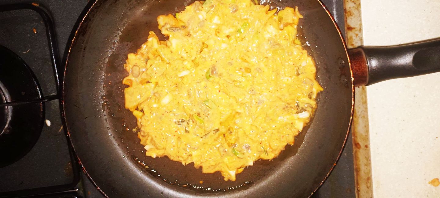 팬을 레인지에 올려 달궈지면 식용유 2숟가락 정도를 두르고 반죽을 떠서 팬에 골고루 펴줍니다. 노릇노릇하게 익었으면 뒤집어서 구워줍니다.