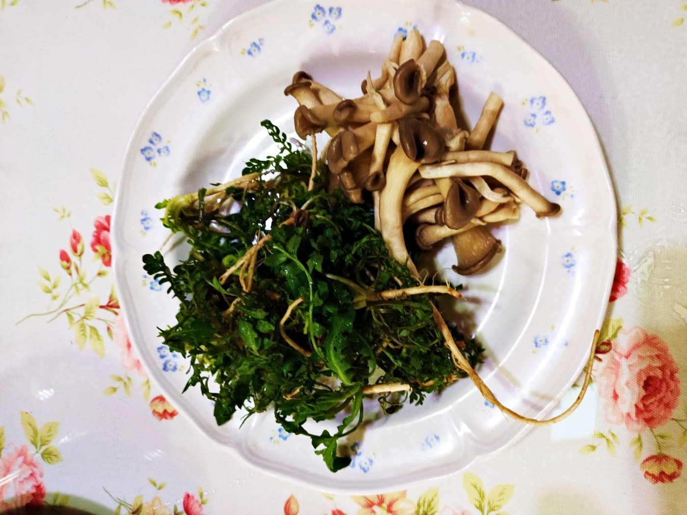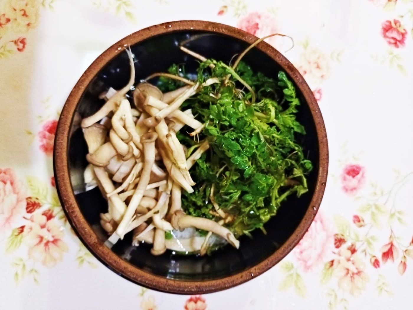 그 위에 냉이와 느타리를 잘게 찢어 얹어 줍니다.