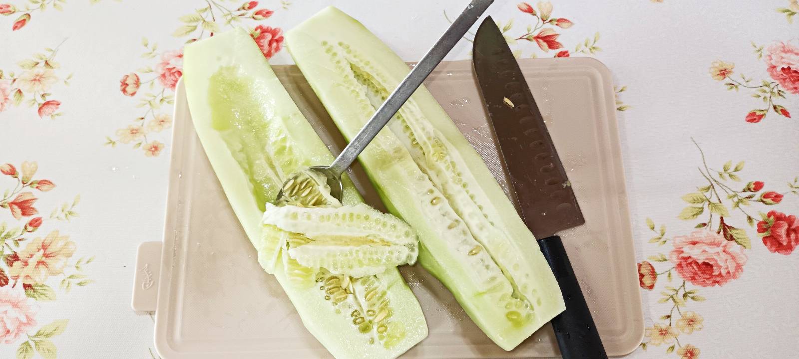 반으로 자른 노각을 숟가락으로 속을 파내 줍니다.