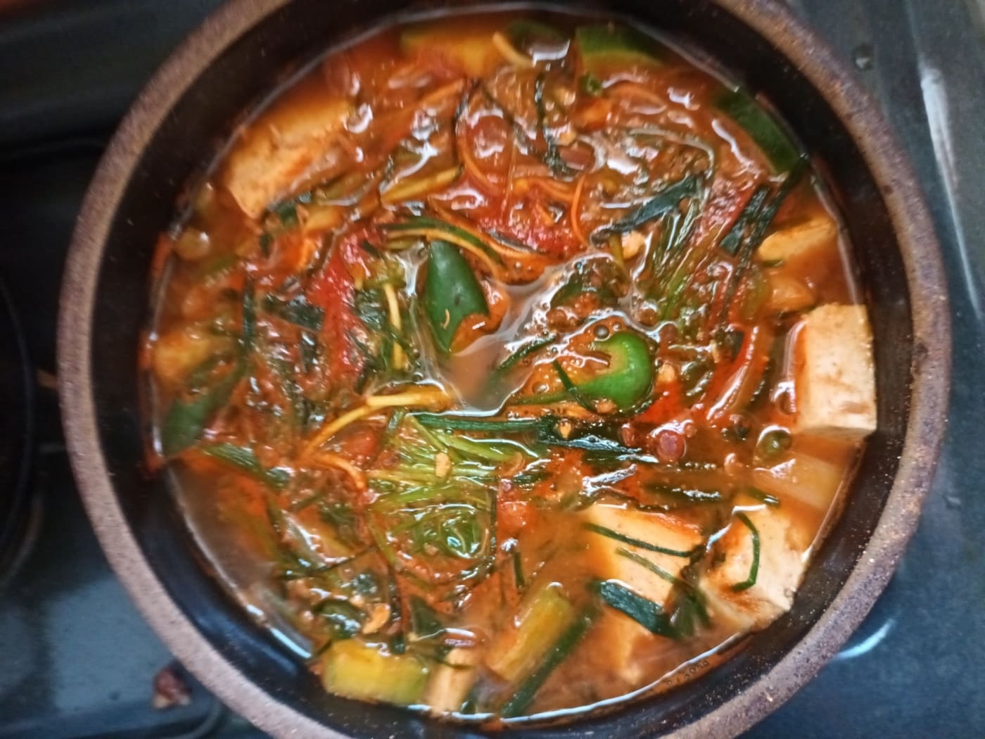 다시 끓으면 마지막에 달래와 청양고추를 넣고 끓어오르면 불을 꺼줍니다. 달래 향기가 집안 가득 퍼집니다.