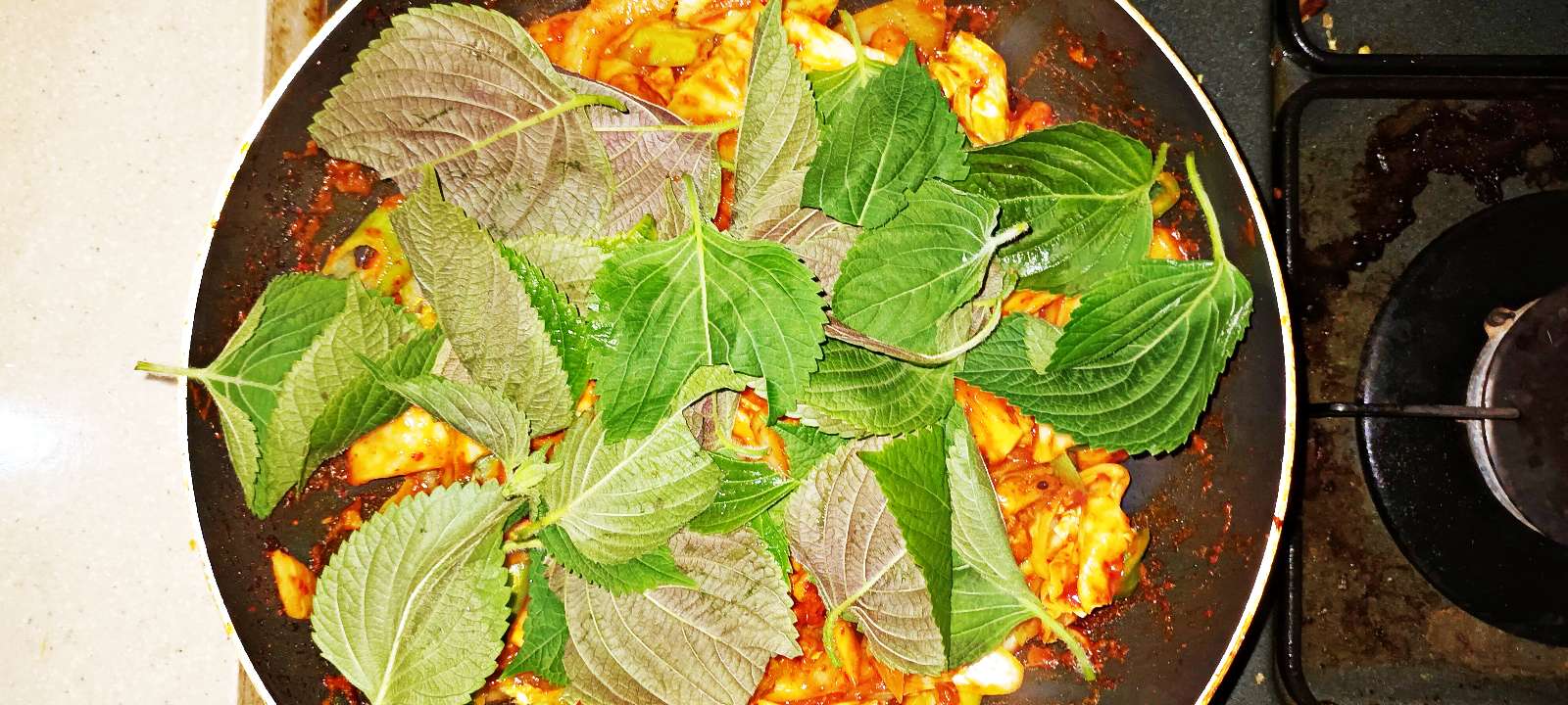 간을 봐 가면서 양념을 다 넣고 대파 청양고추를 넣어주고 볶다가 마지막에 파란 깻잎을 넣고 볶아줍니다.