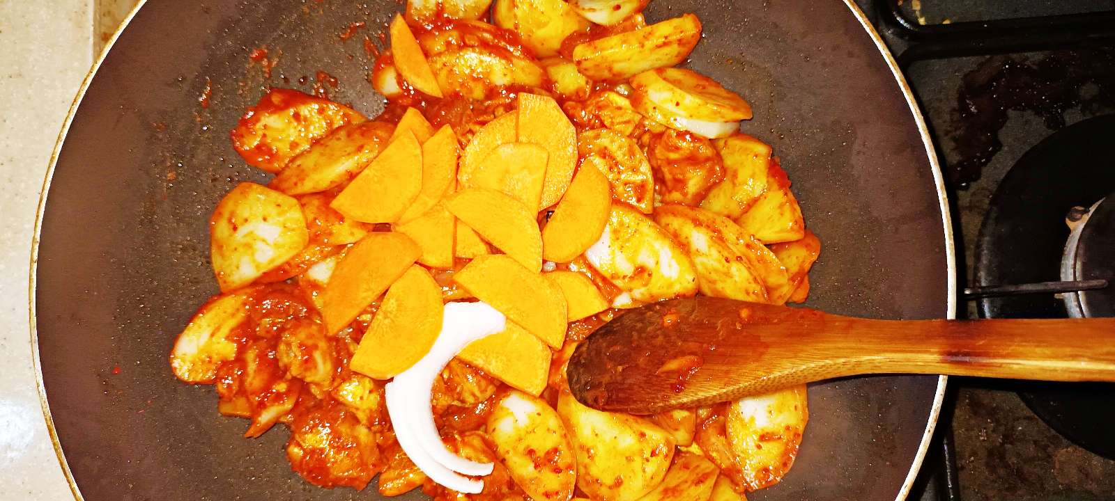 오늘은 닭갈비 만드는법을 집에 있는 재료로 함께 해보았습니다. 여러분께 팁을 드리자면 떡볶이 떡과 고구마를 원래 넣습니다. 카레 가루도 숟가락 넣으시면 닭 비린내도 잡아준다고 합니다. 풍미도 좋겠지요. 오늘은 춘천 닭갈비를 감자를 넣고 만들어 보았습니다, 얼른 맛있게 먹겠습니다. 여러분들도 오늘은 뭐를 해서 드실까 고민이 되실 때 춘천 닭갈비를 만들어 보세요. 오늘도 건강하세요.