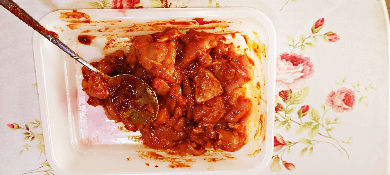 썰어 놓은 닭다리 살에 양념장 3분 1을 넣어 조물조물 무쳐 놓습니다.