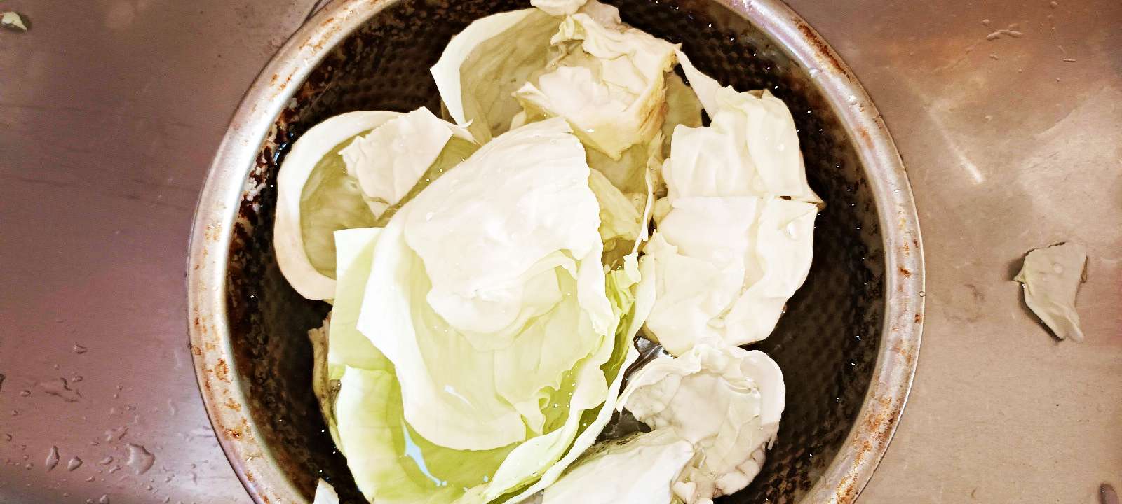 양배추를 깨끗이 씻어 그릇에 식초 2숟가락을 넣어 잘 섞어서 양배추를 물에 담가둡니다. 농약 성분을 제거해 줍니다.