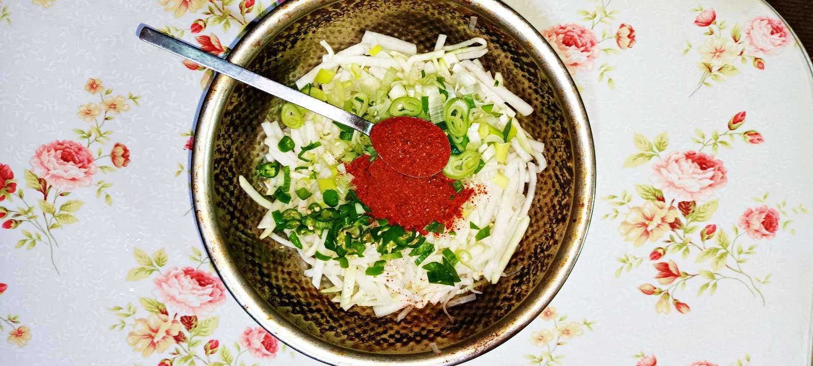 무채가 살짝 부드러워져서 물이 생겼으면 물을 따라 버린다.