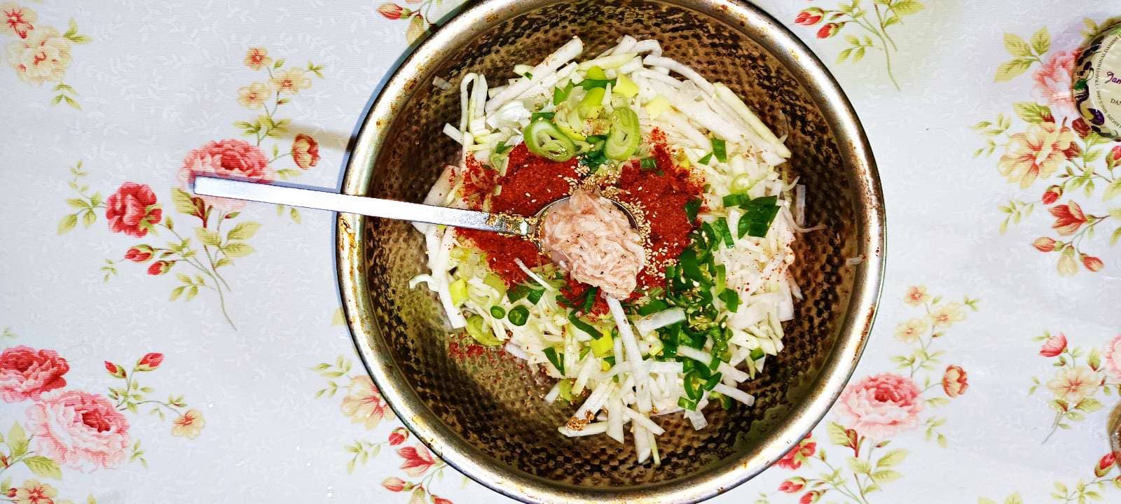 고춧가루, 참기름, 깨소금, 새우젓, 생강청, 을 넣어주고 살살 버무려 주세요.