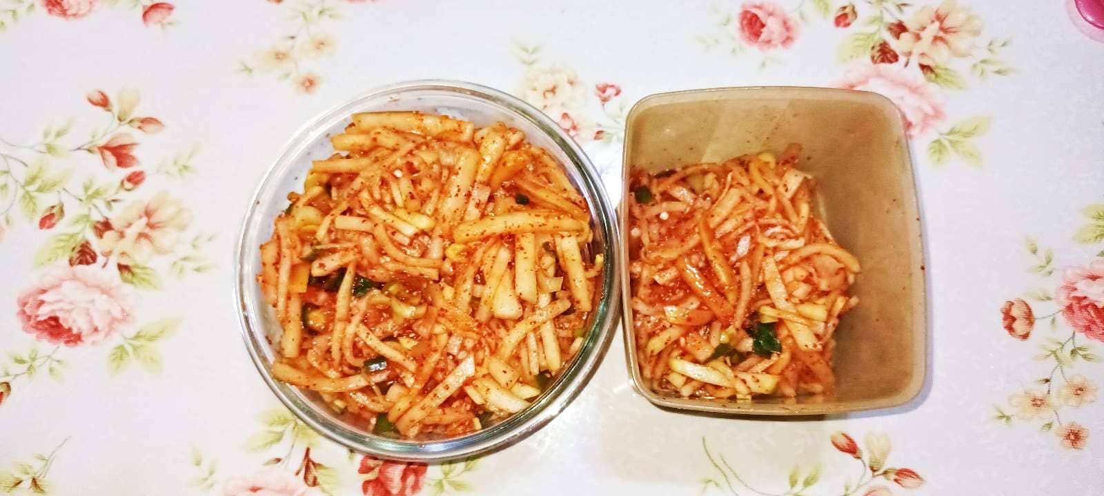 반찬그릇에 담아 봤습니다. 무생채가 아주 먹음직스럽습니다. 냉장고에 넣어 두시면 몇 끼는 걱정이 없을 거 같습니다.
