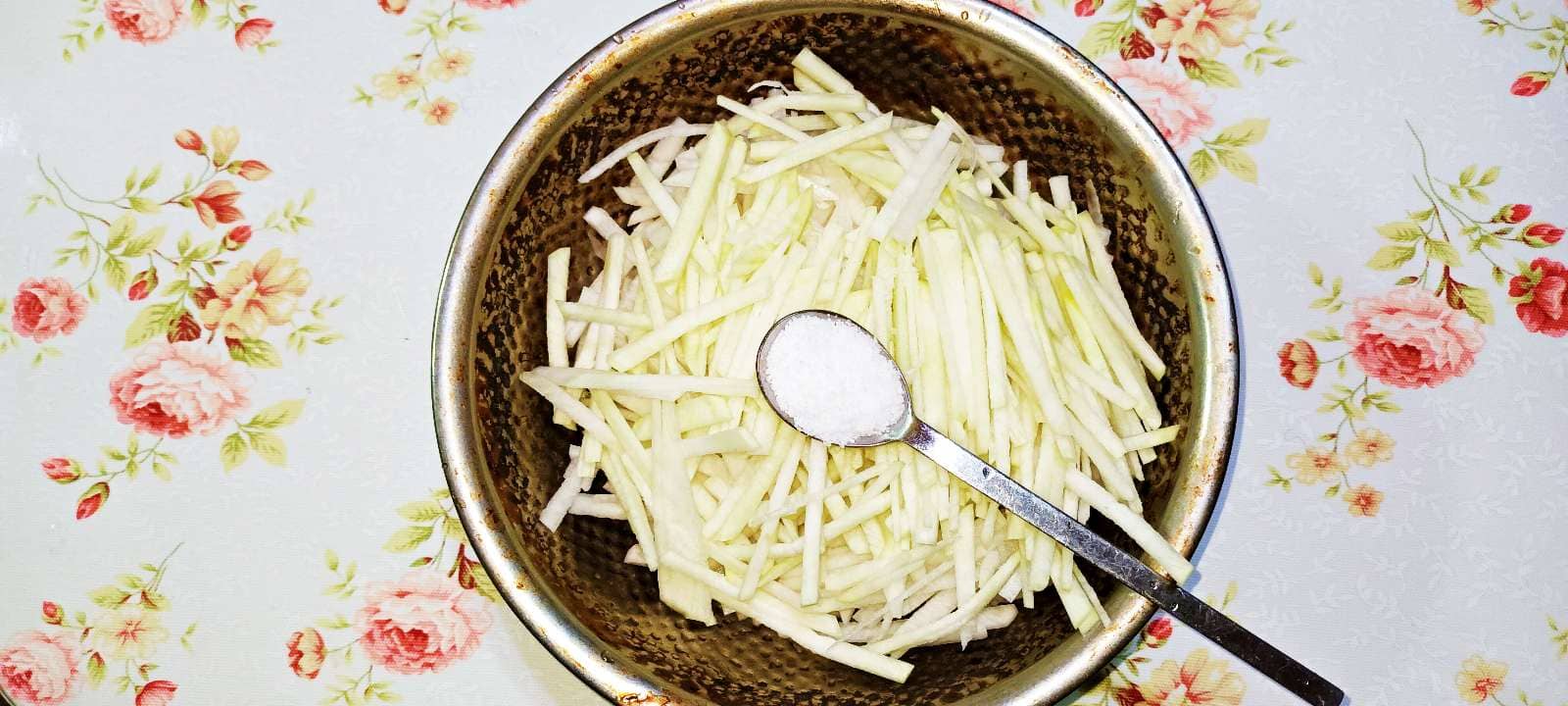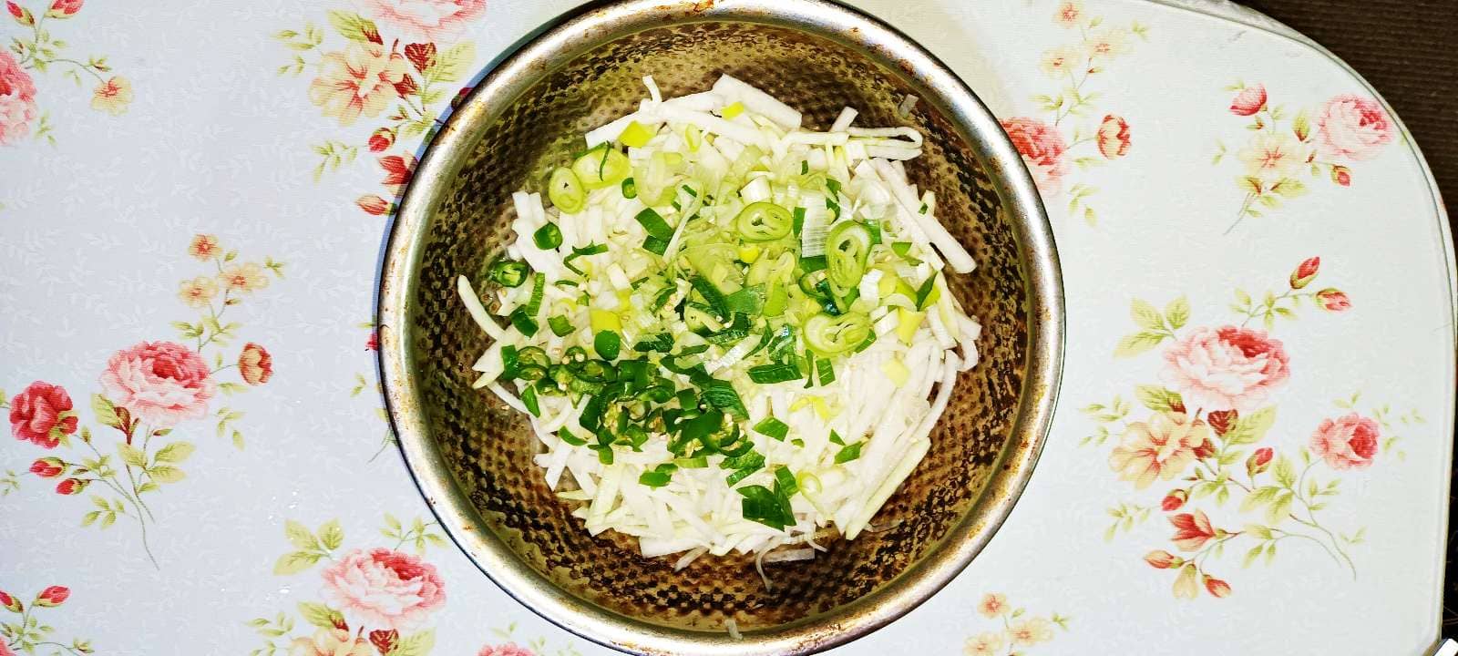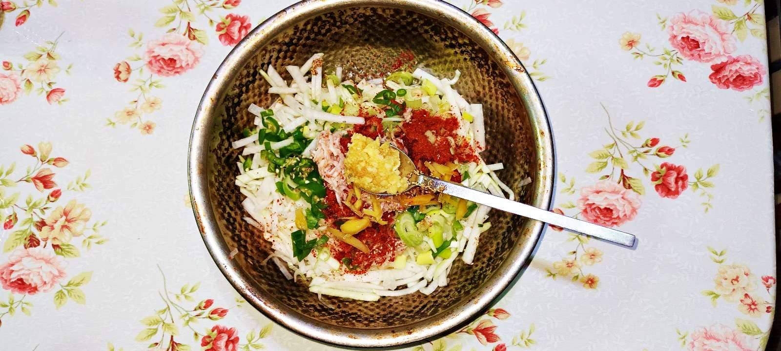 무채 썰어서 소금 반 숟가락 넣고 무쳐둡니다.
