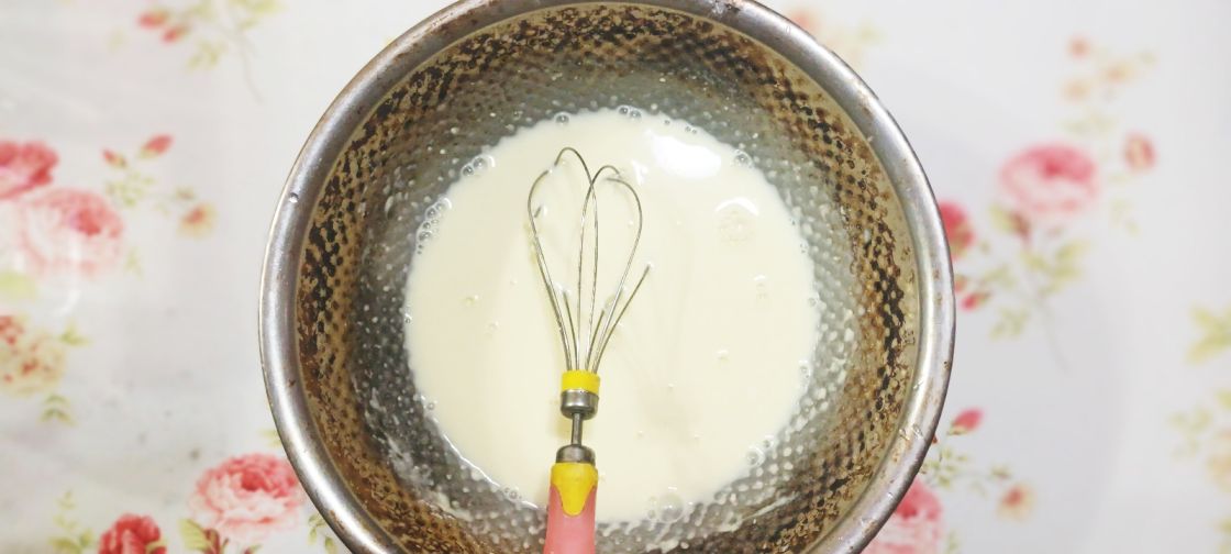 넓은 볼에 밀가루에 다시마 우려낸 물을 넣고 거품기로 잘 저어 줍니다. 반죽의 농도는 숟가락으로 떴을 때 줄줄 흘러야 됩니다.