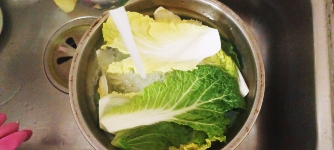 봄 동과 알 배추를 깨끗하게 씻어 체나 바구니에 담아서 물기를 빼줍니다.