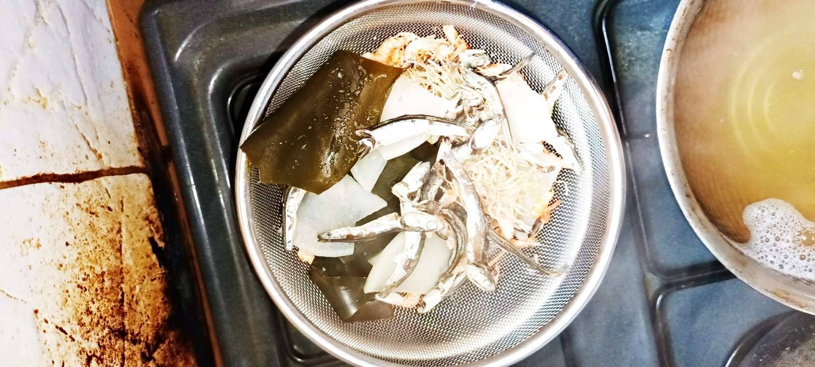 육수가 다되었으면 채에 받아 국물을 걸러줍니다.