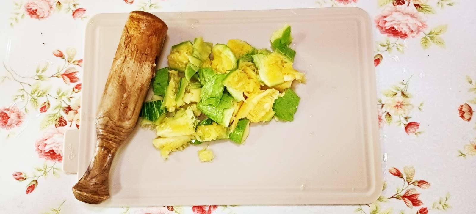 호박은 길이로 4 등분하여 방망이로 두드려 으깨어 놓습니다.