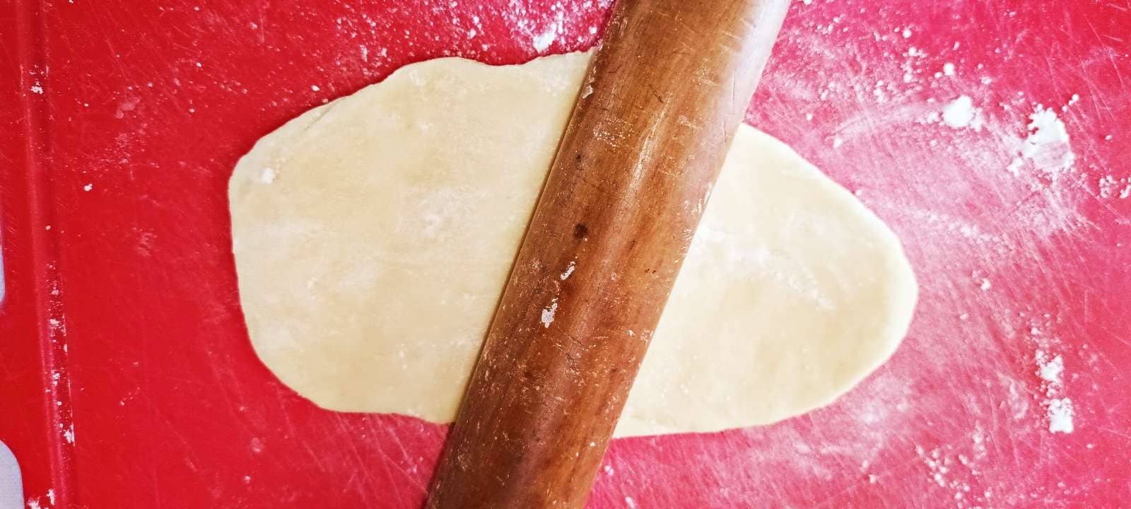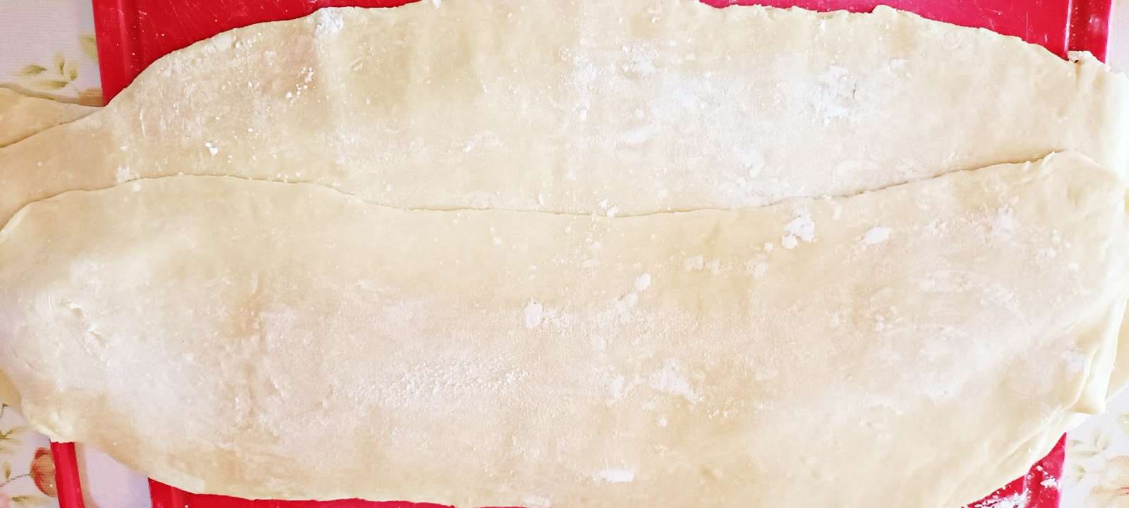 다 밀었으면 칼로 붙지 않도록 밀어 놓은 반죽에 밀가루를 발라서