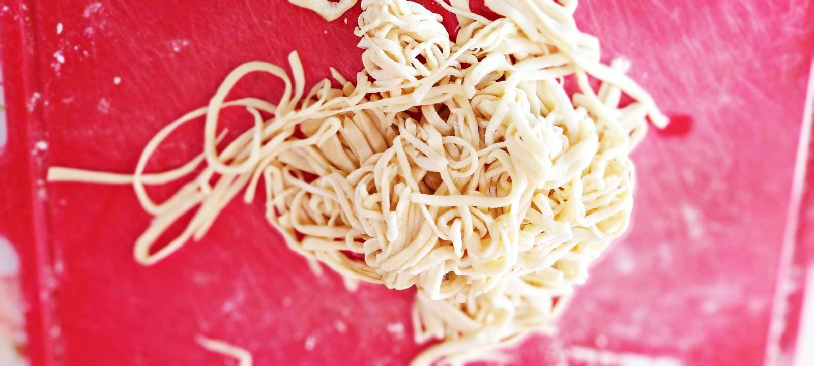 썰어놓은 칼국수가 둘러붙지 않도록 밀가루를 솔솔 조금만 뿌려서 칼국수를 손으로 살살 털어줍니다. 냄비에 물을 1리터쯤 부어 끓으면 구수를 살살 뿌리듯이 넣어 줍니다.