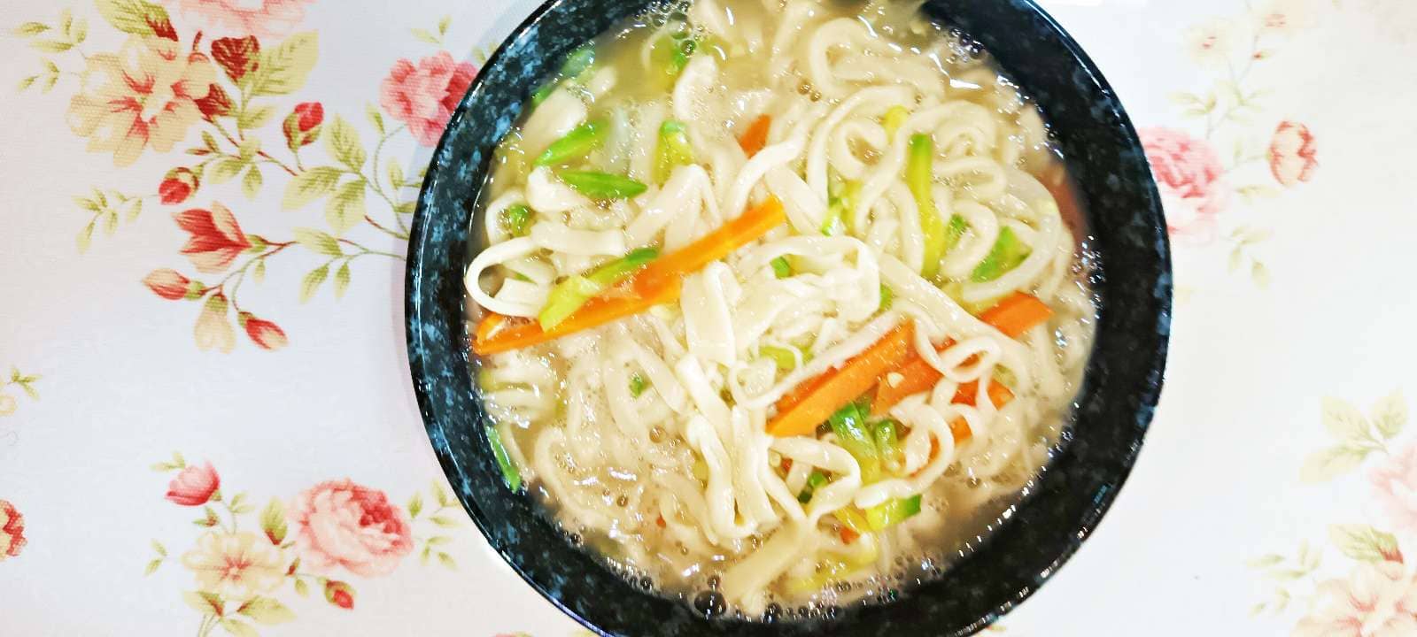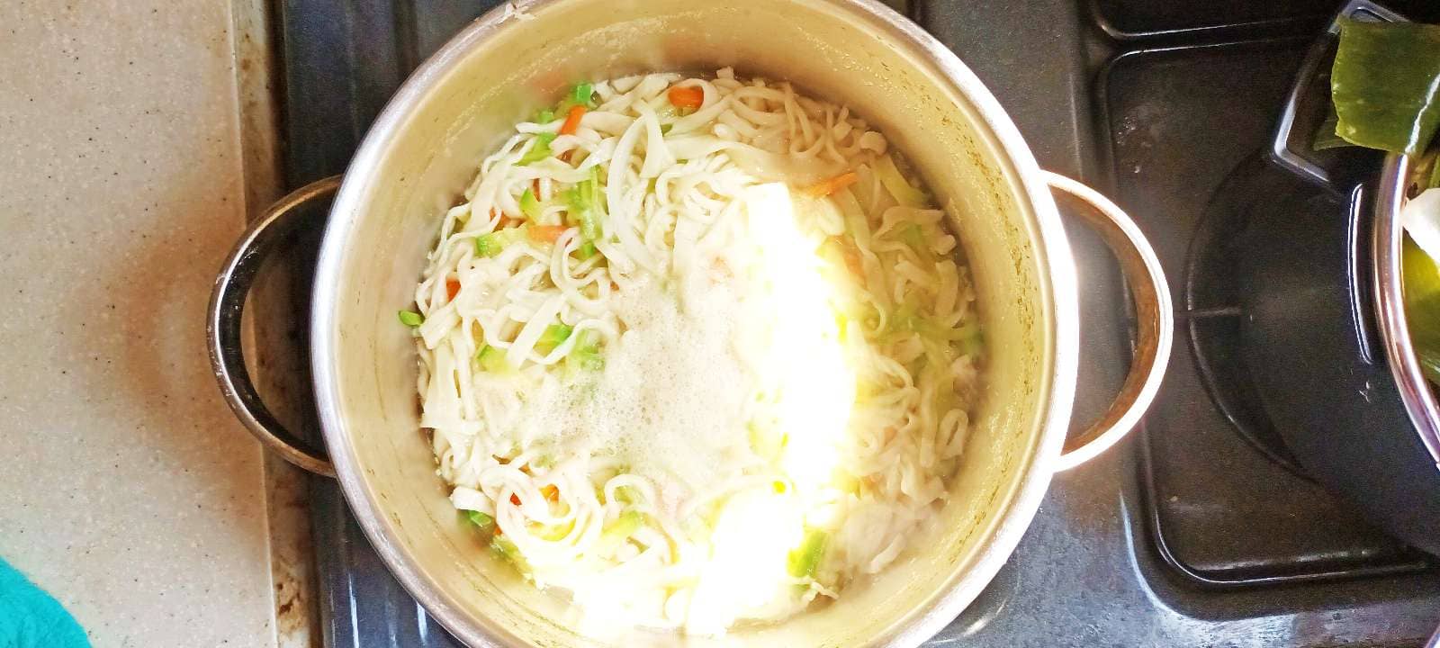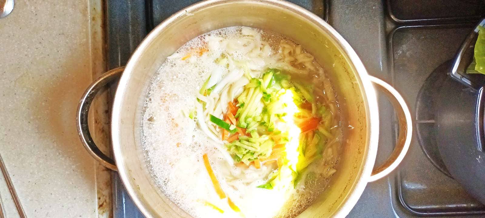 국수가 끓기 시작하면 채 썰어놓은 야채들을 넣어줍니다.