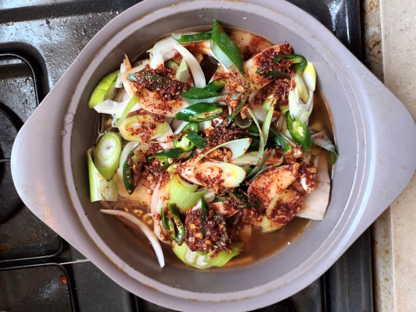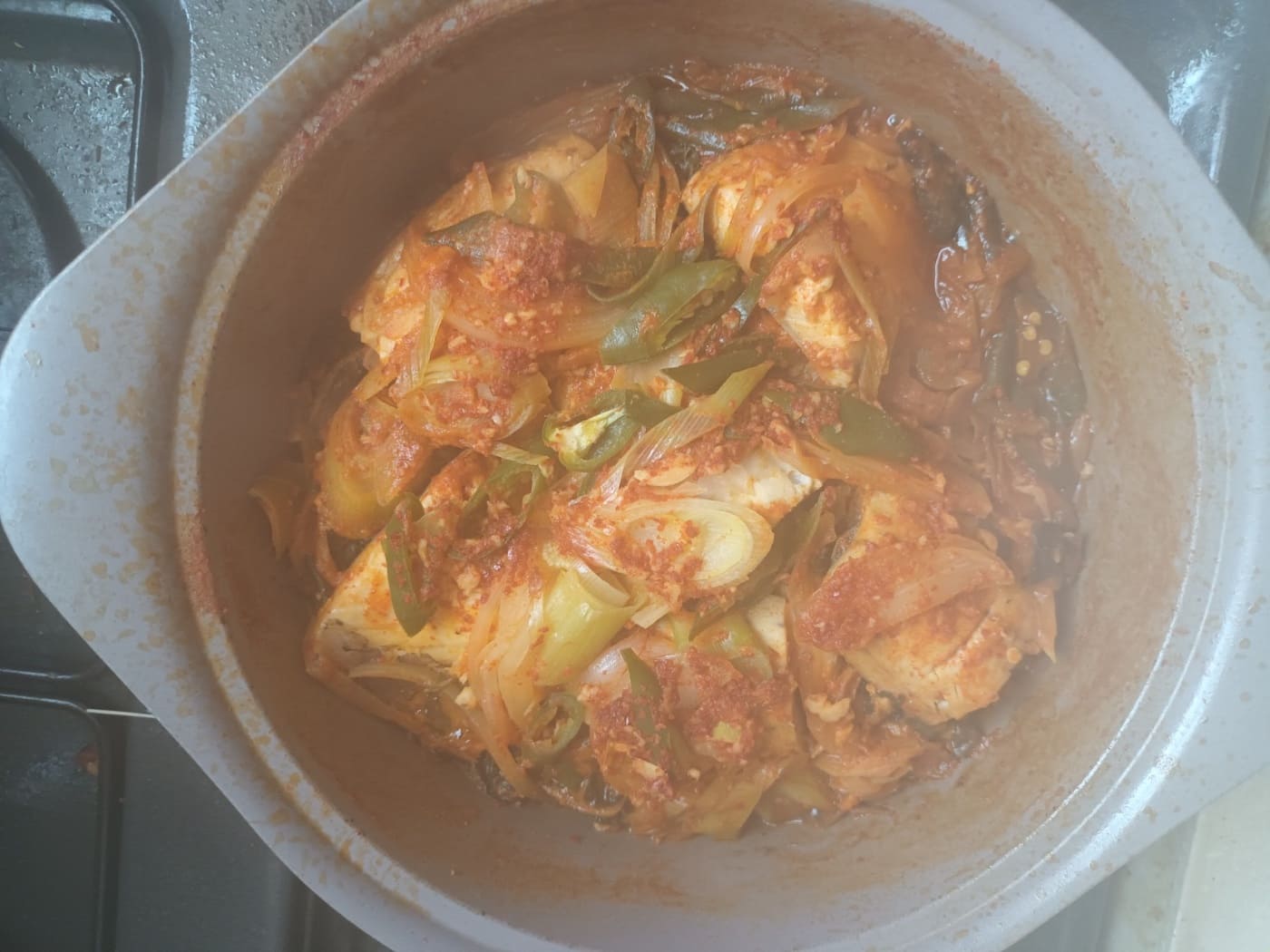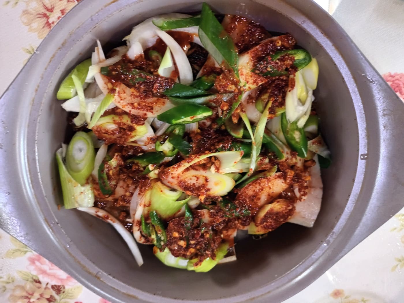 양념재료: 고춧가루2, 숟가락, 된장 1숟가락, 고추장 2숟가락, 진간장 2숟가락, 참 기름 1숟가락, 물엿 1숟가락 멸치 국물 낸 것 3컵 정도