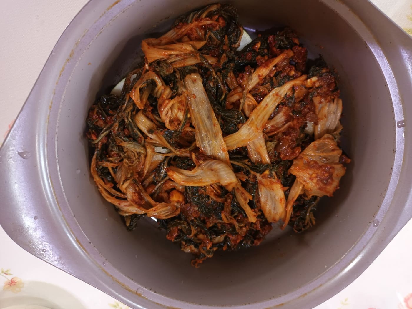 3. 냄비에 양념된 우거지를 무위에 고르게 얹어줍니다.