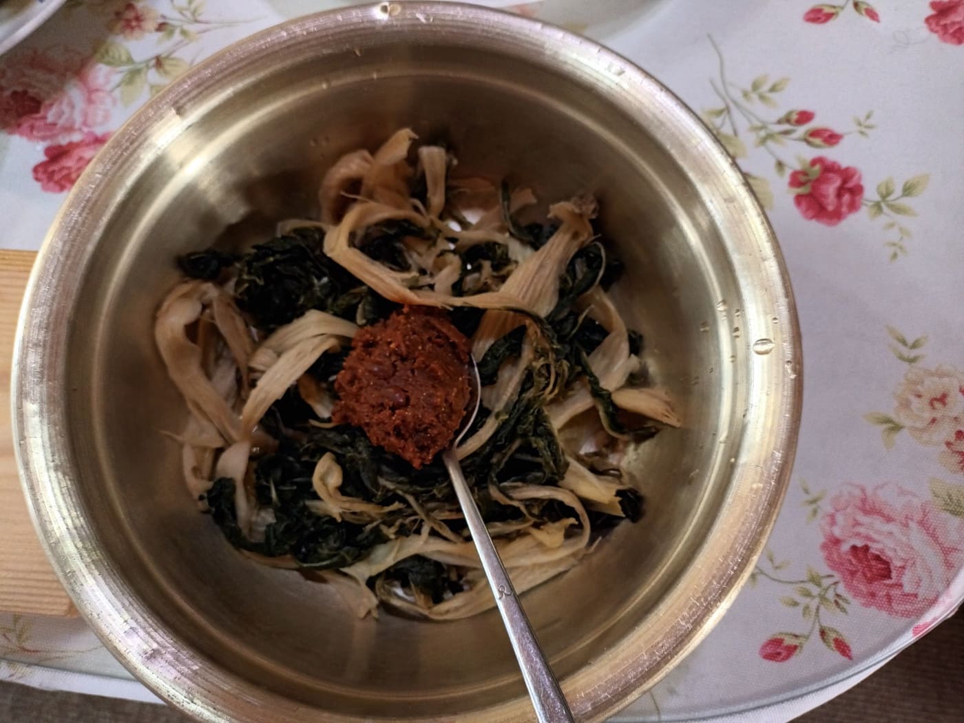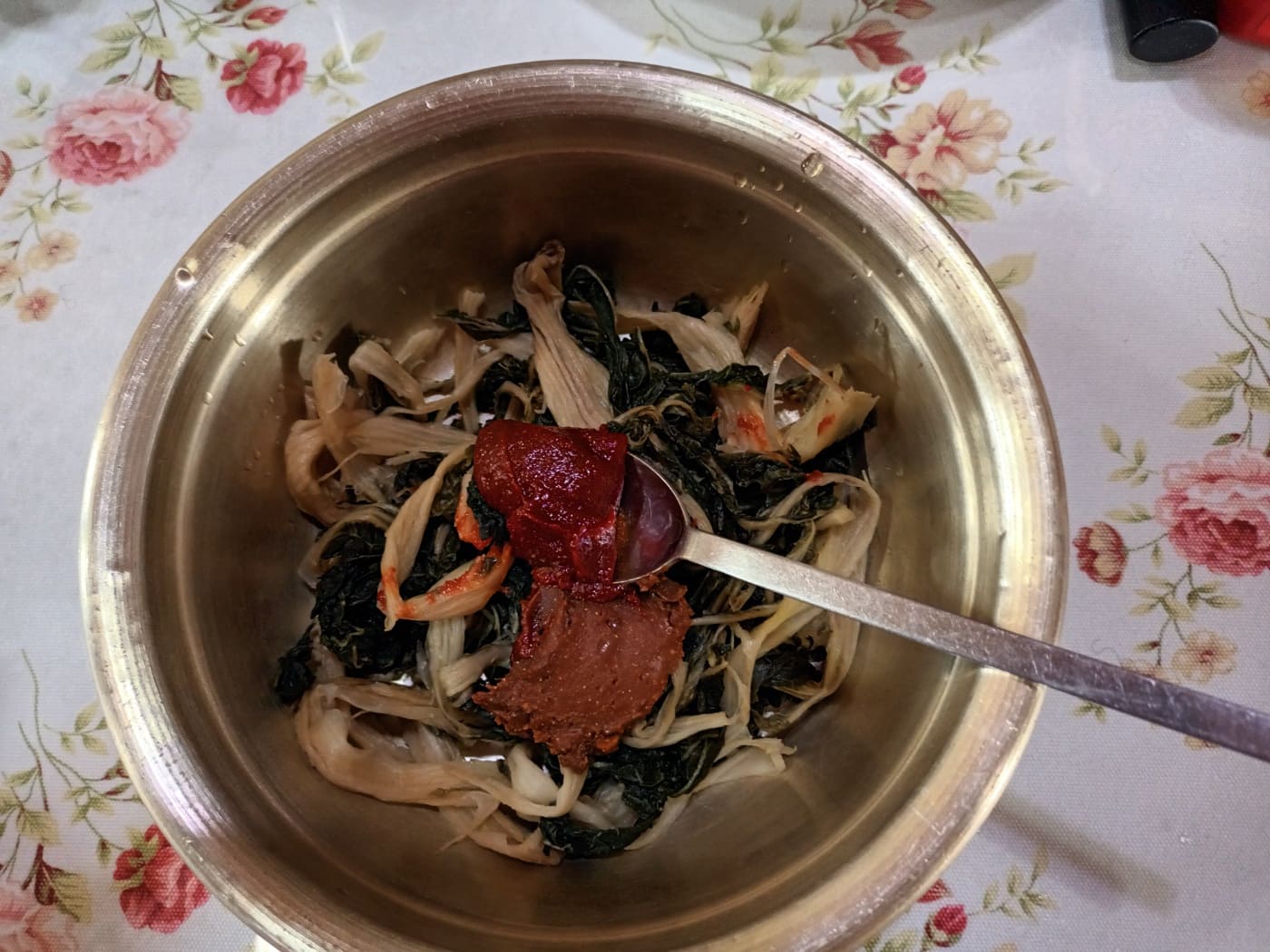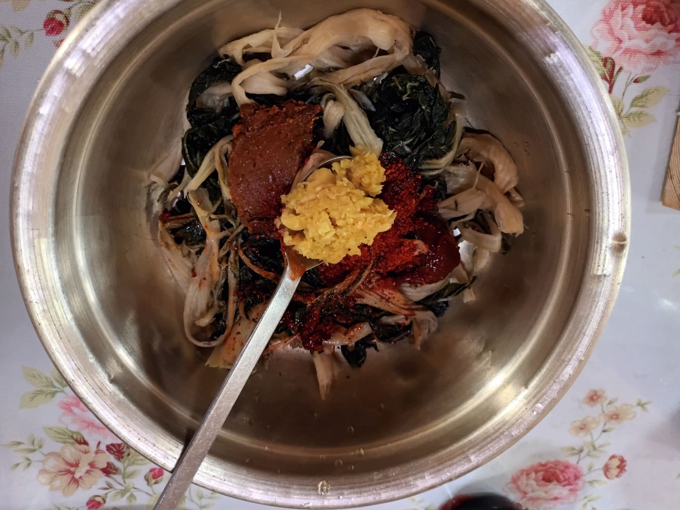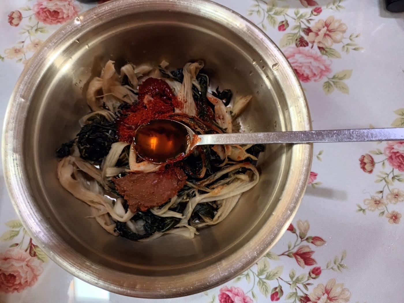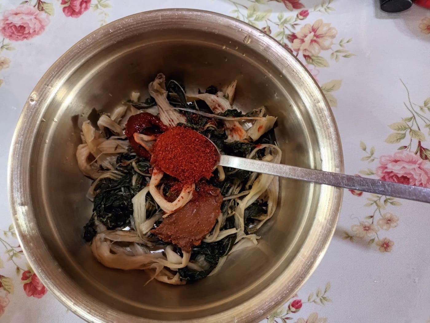 된장 1숟가락, 고추장 1숟가락, 고춧가루 1숟가락, 참기름 1숟가락, 마늘 1숟가락을 넣고 조물조물 무쳐 둡니다.
