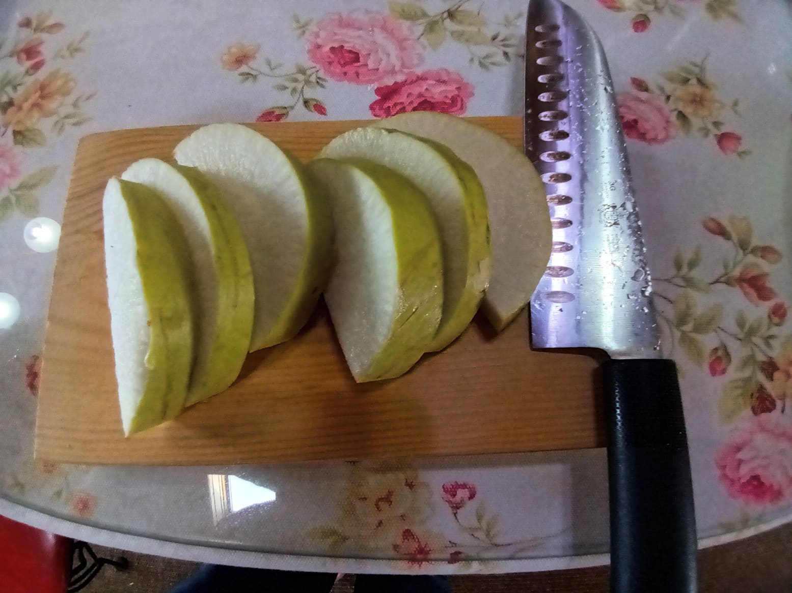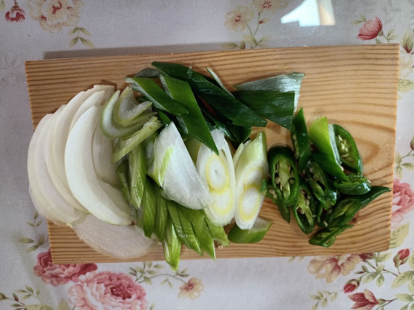 5. 양파, 무, 대파,청량 고추는 어슷 썰어 준비합니다.