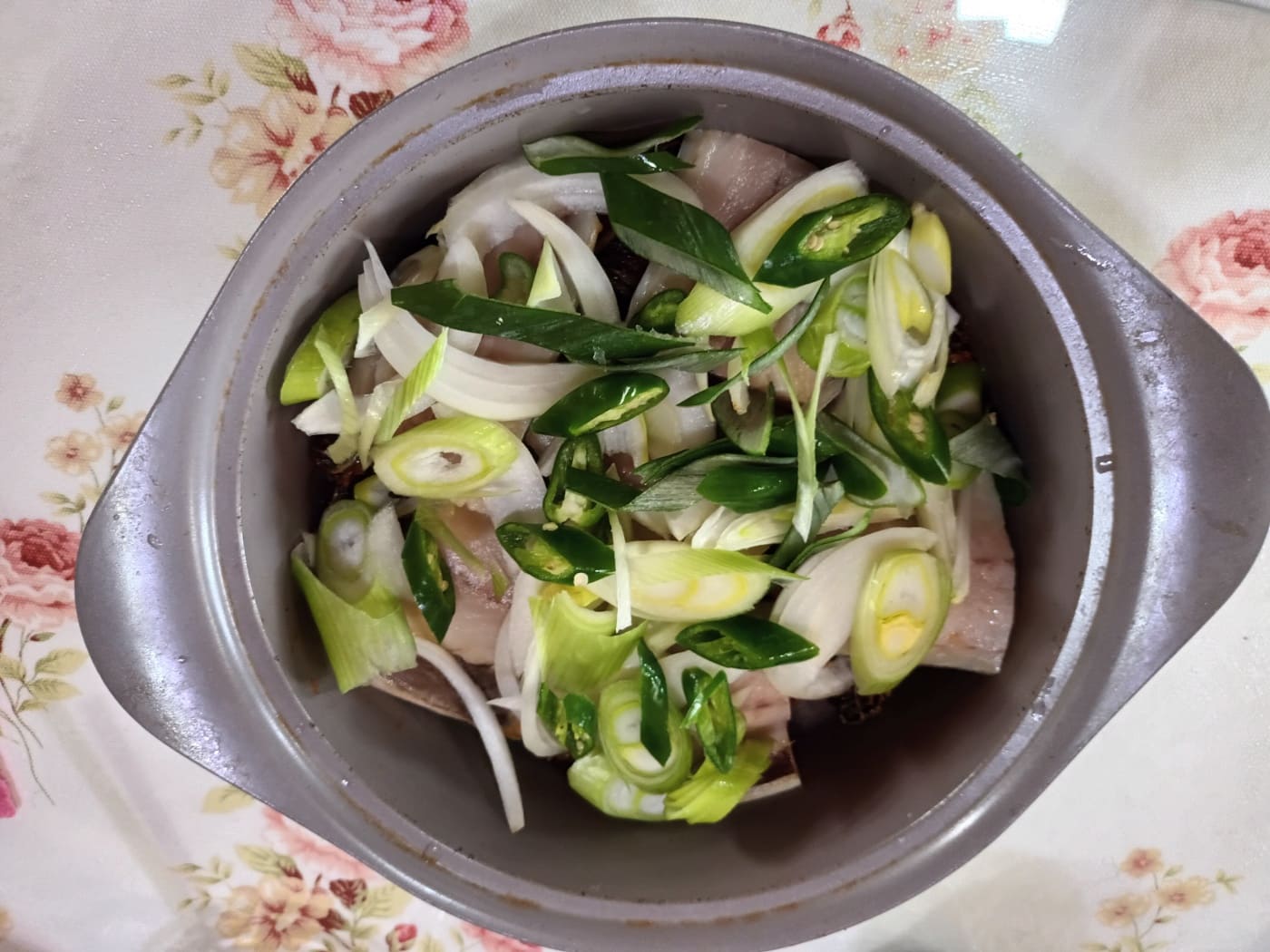 6. 냄비의 우거지위에 손질된 고등어를 얹어주고 양파, 대파, 청양고추를 얹어 줍니다.