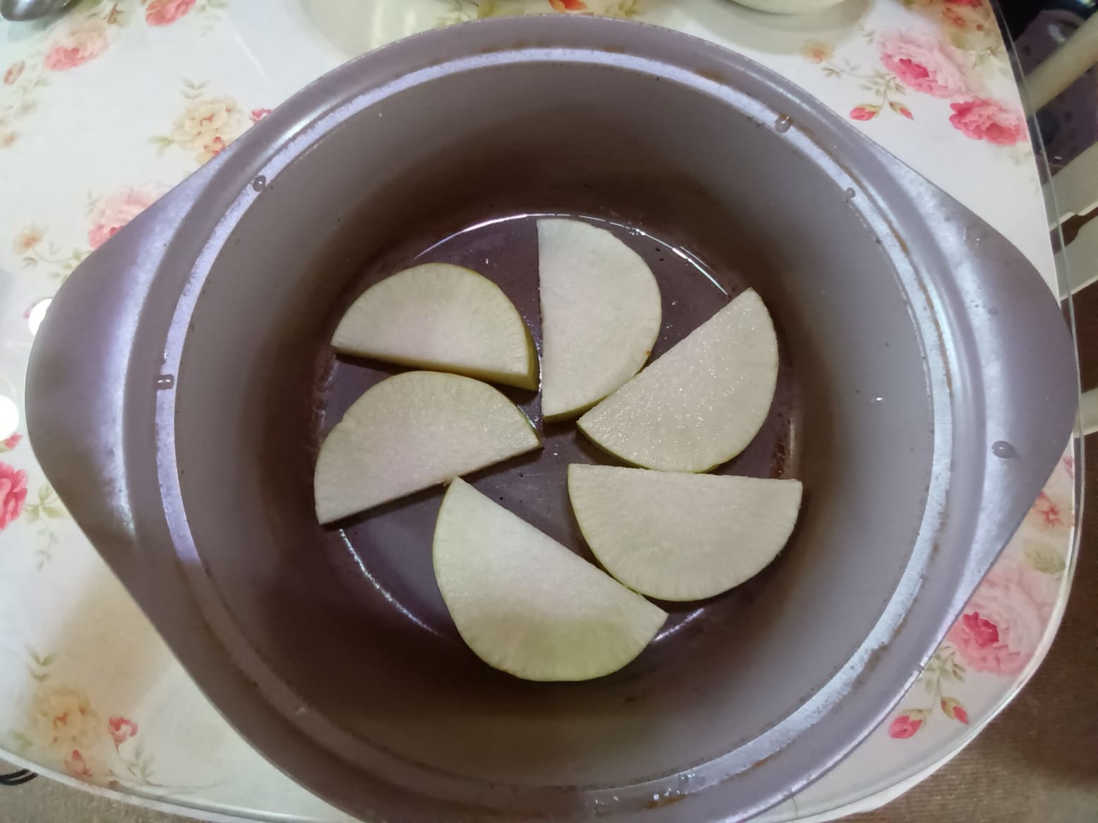 2. 무는1.5센티 정도 잘라서 반으로 잘라서 냄비에 깔아줍니다.