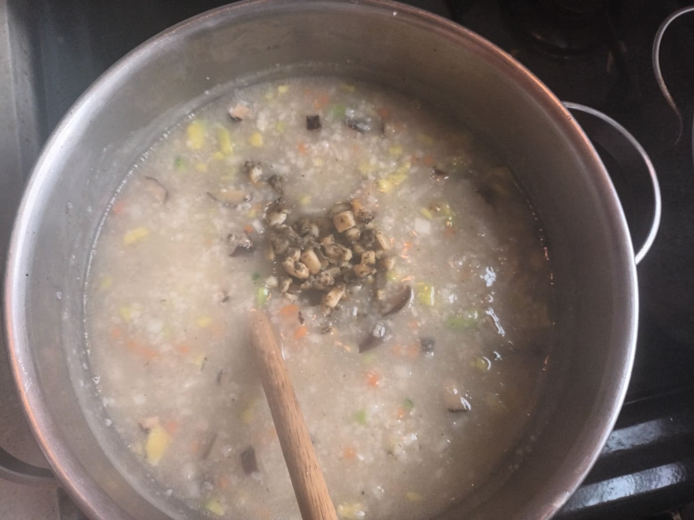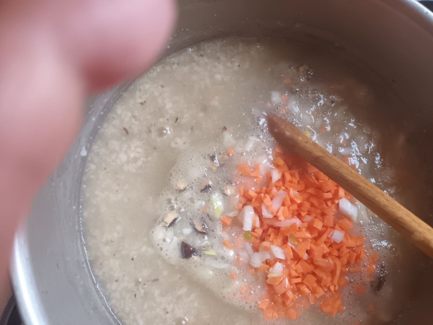 12. 죽이 어느 정도 죽의 쌀이 말갛게 익었으면 이때 전복내장 설어둔 야채를 넣어줍니다.