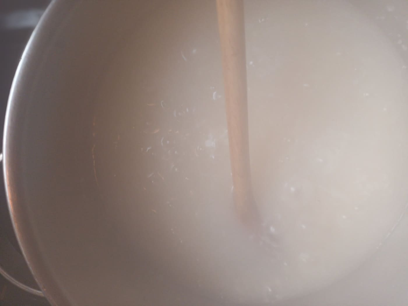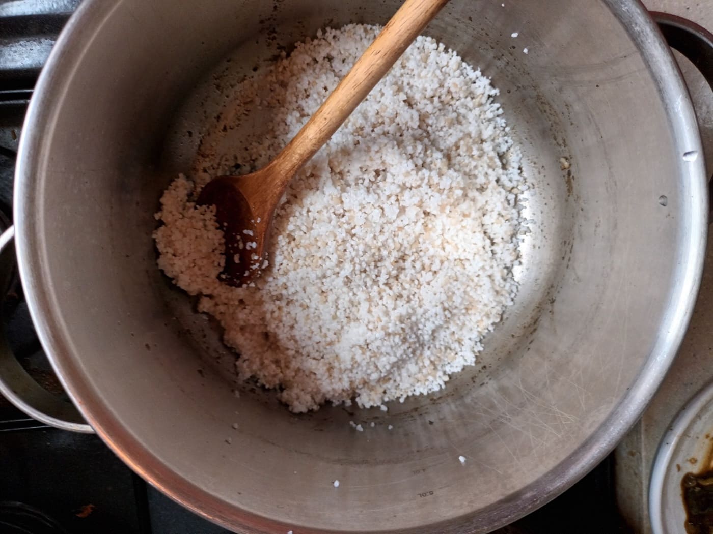 11. 어느 정도 볶아준 쌀에 멸치 다시마 국물을 부어주고 저어 가면서 죽을 끓여 줍니다.