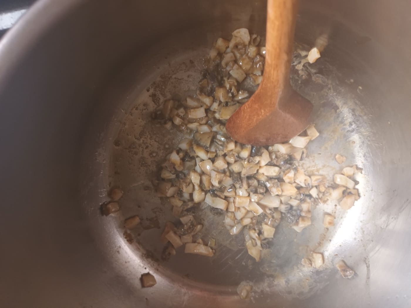 8.  냄비를 불에 올려 달궈지면 참기름을 넣고 전복 다진 것을 넣고 볶아줍니다.
