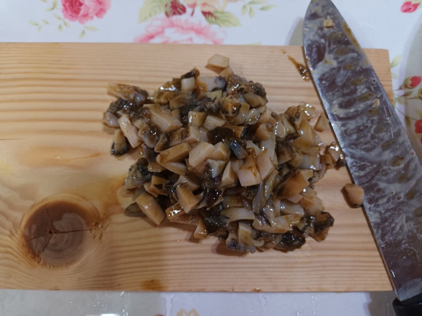 4. 전복도 잘게 썰어놓는다. 내장도 다져 줍니다.