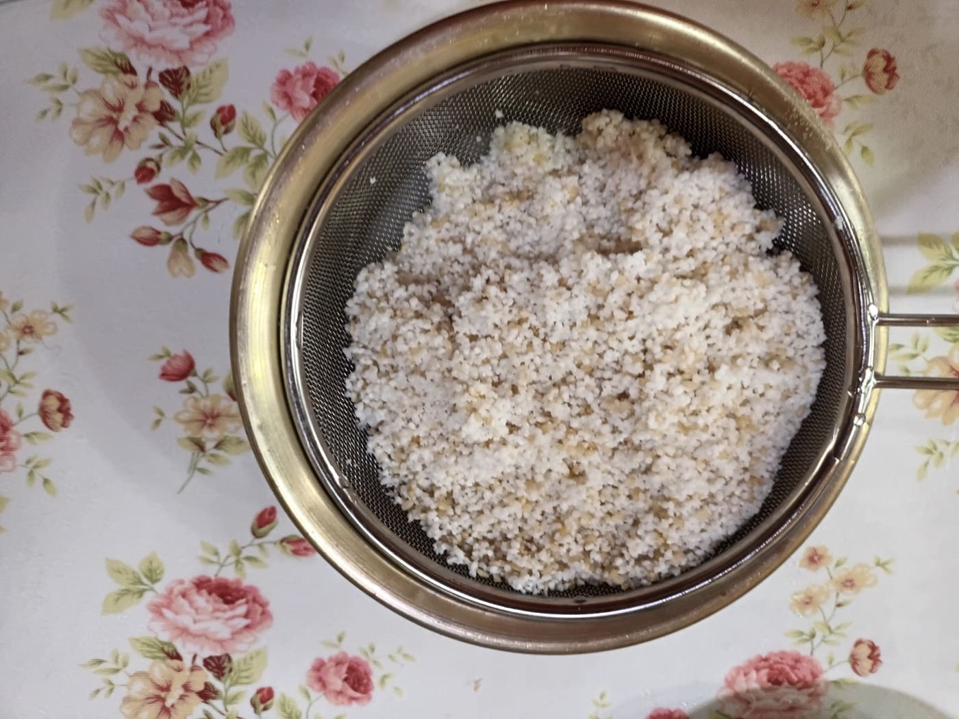 7.  살짝 갈아둔 쌀, 현미도 체에 받쳐 물기를 빼줍니다.