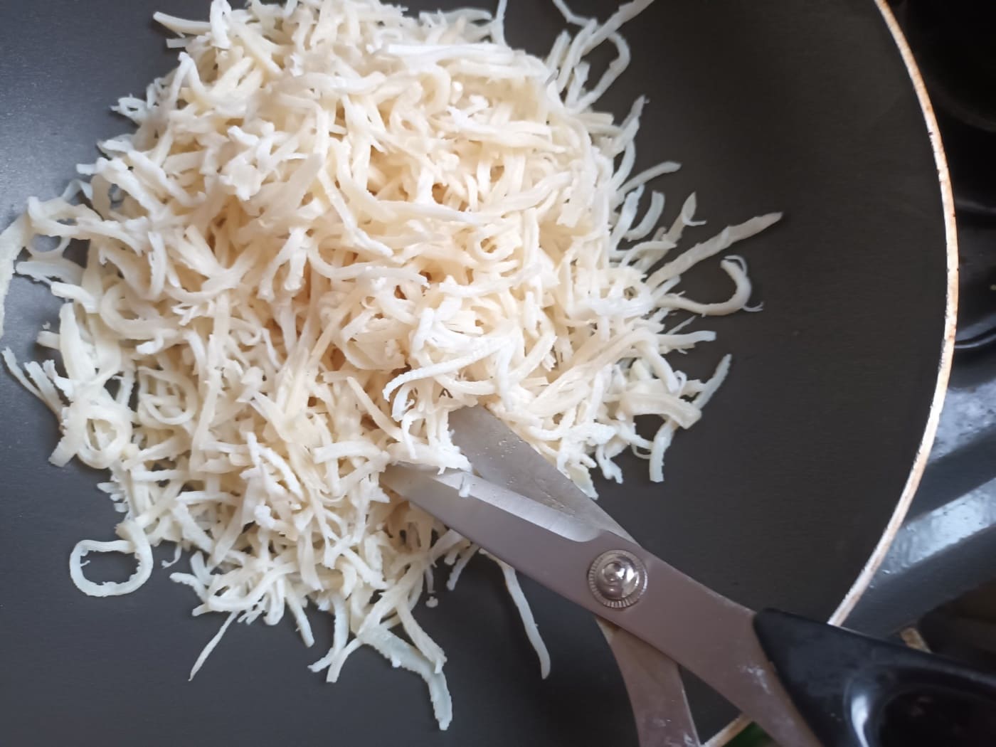 팬을 달궈진 미채를 가위로 먹기 좋은 크기로 잘라줍니다.