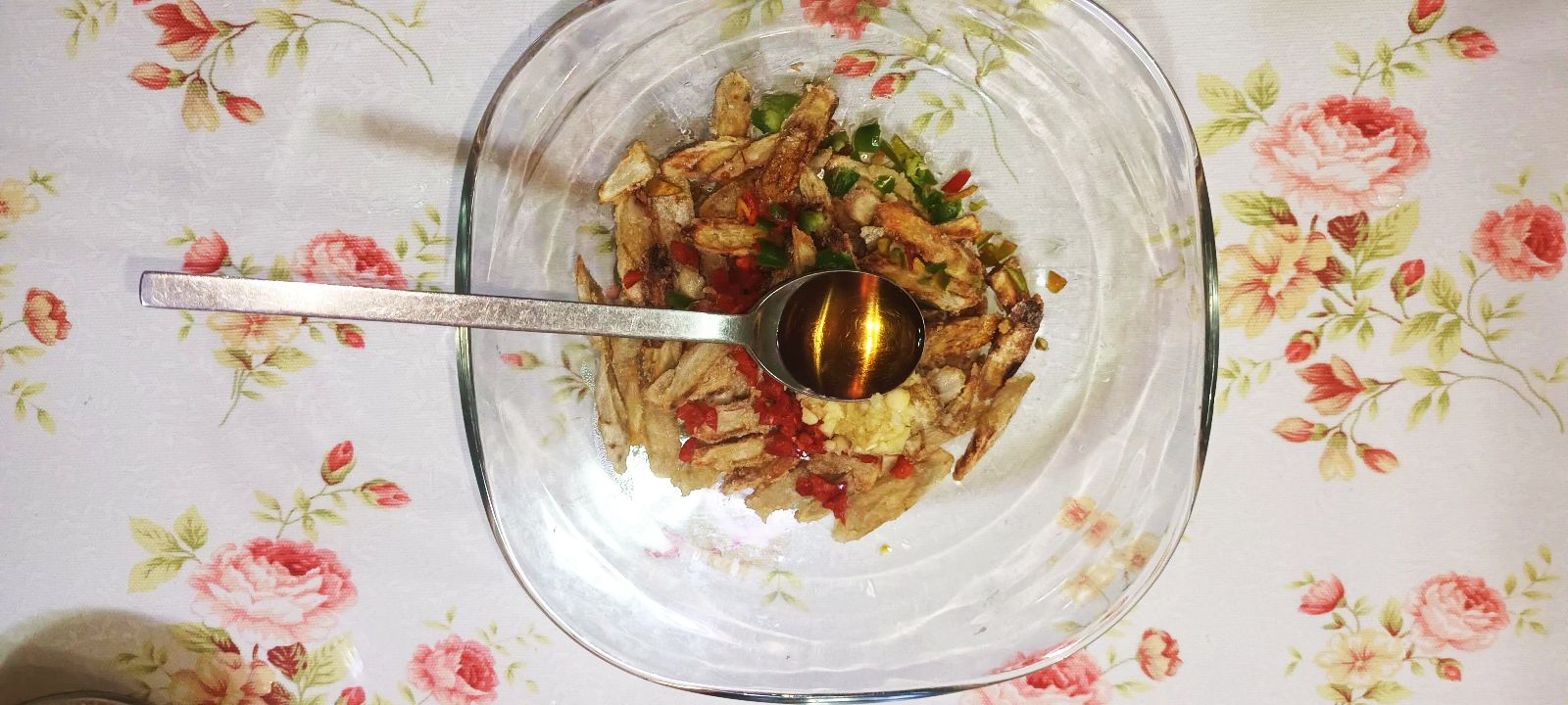 구워진 우엉을 볼에 담아 마늘 조금, 청양고추, 홍고추, 간장, 참기름, 들기름, 통깨 등 위 찹쌀 부침 우엉 무침 레시피 재료 글의 양념을 넣어서 골고루 무쳐 줍니다.