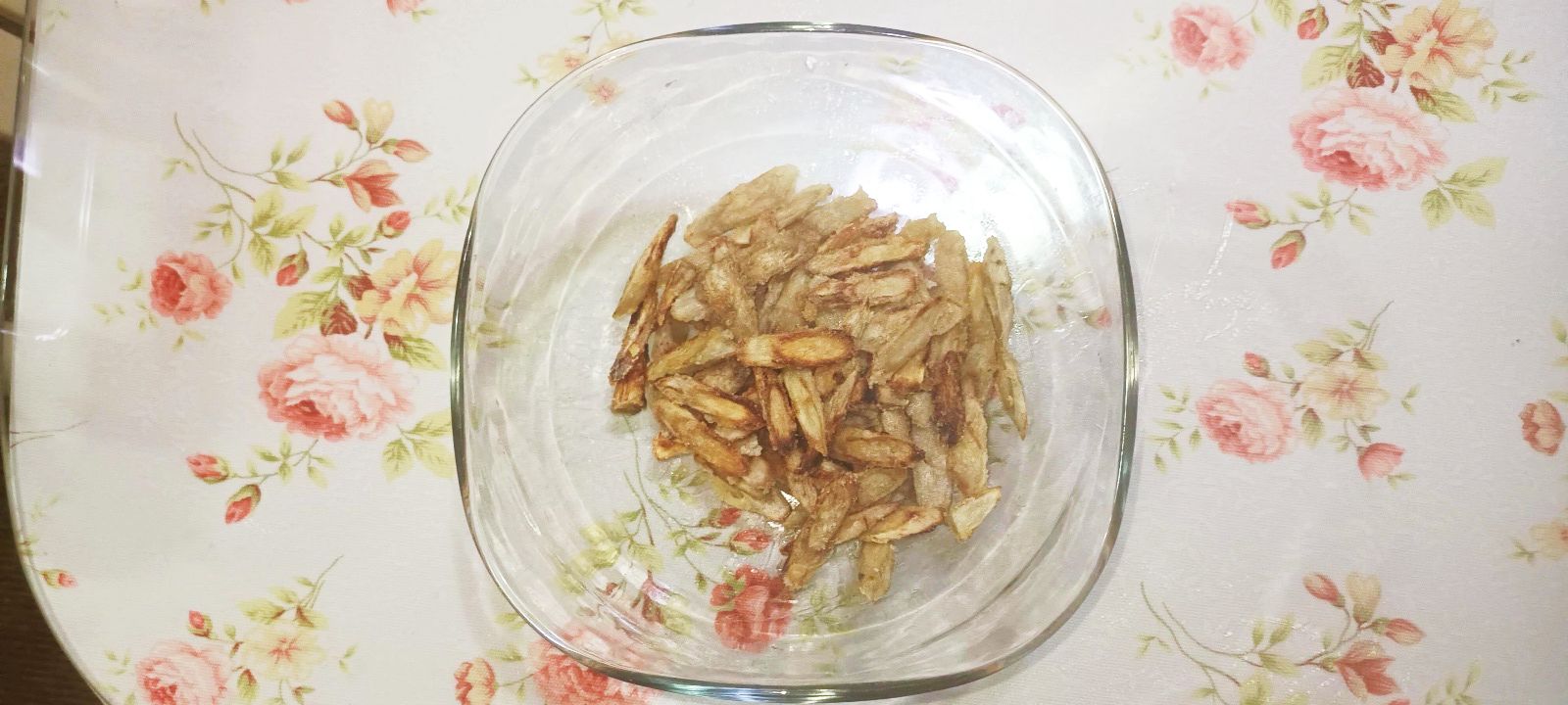 찹쌀가루를 묻힌 우엉을 팬에 노릇노릇 구워 줍니다. 바싹하게 튀기듯이 구워주시면 더 맛있습니다.