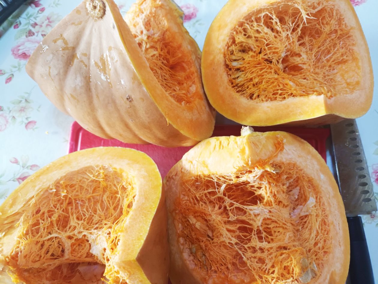 늙은 호박은 4 등분해서 겉껍질을 위의 사진과 같이 깎아서 벗겨 줍니다.